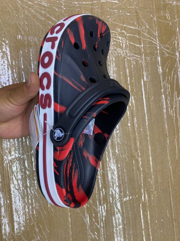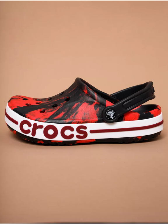 Crocs Bayaband Red Black Printed — красные сабо с ярким принтом и контрастной чёрной подошвой. Модель выполнена из лёгкого материала Croslite, который обеспечивает амортизацию и удобство при ходьбе. Верх с перфорацией способствует вентиляции, а классический дизайн дополняется поворотным ремешком для надёжной фиксации стопы